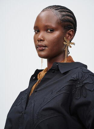 Elegante Bluse aus 100% Baumwolle mit klassischem Kragen und durchgehender Knopfleiste. Die Bluse hat lange Ärmel mit breiten Manschetten und drei Knöpfen, sowie eine lockere Passform mit einem leicht abgerundeten Saum. Ton-in-Ton Blumenstickereien und kleine Perlendetails auf der Brust verleihen dem schlichten Design einen dezenten, femininen Touch.
