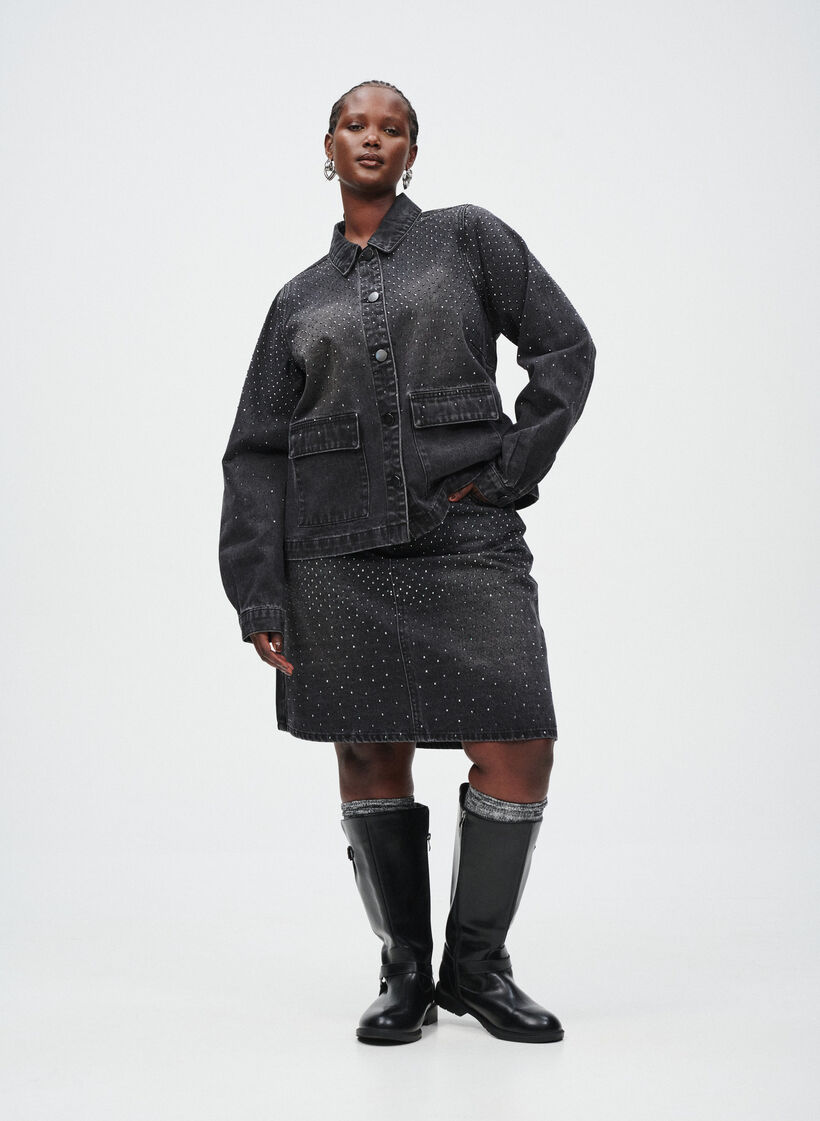 Jeansjacke mit Strasssteinen und großen Taschen auf der Vorderseite
