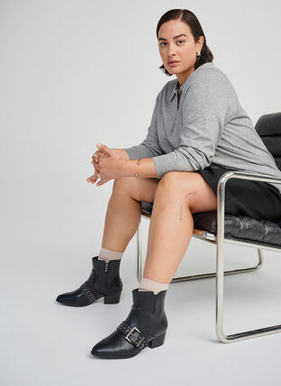 Knöchenstiefel aus 100 % Leder mit weiter Passform und extra weiter Schaftweite, speziell für breitere Füße designt. Die Stiefel haben eine Spitze Zehenkappe, einen Zierriemen mit Nieten und einen 5 cm Blockabsatz, der dir einen angenehmen Höhenvorteil verschafft. Ein Reißverschluss an der Innenseite und ein dezenter, elastischer Einsatz sorgen für einfaches An- und Ausziehen und eine flexible Passform am Knöchel. Die Stiefel bieten Platz für Einlagen.