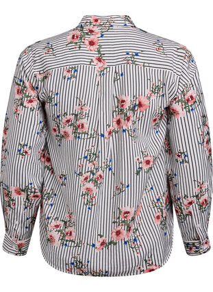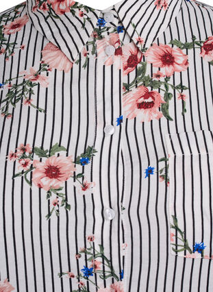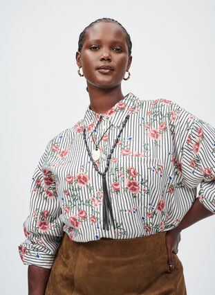 Chemise en viscose légère et douce, ornée d'un imprimé floral féminin associé à de fines rayures. Elle présente une coupe ample, un col chemise classique, une fermeture boutonnée devant, une poche poitrine et des manches longues avec poignets.