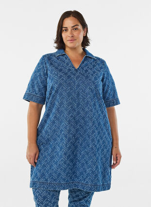 Robe courte en jean 100 % coton, ornée d'un motif texturé ton sur ton et d'un effet délavé légèrement usé. Elle est dotée d'un col classique, de poches pratiques, d'un col en V et de manches courtes avec de larges poignets. Coupe décontractée.