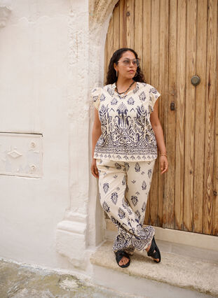 Hose aus einem weichen und leichten Viskosematerial mit einem dekorativen All-Over-Print. Die Hose hat eine lockere Passform mit gerade geschnittenem Bein, Seitentaschen und einer hohen Taille mit elastischem Bund und Kordelzug.