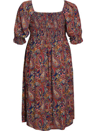 Feminines Kleid mit feinem Blumenprint, das in einem herrlichen Viskosematerial gefertigt ist. Das Kleid hat halblange Ärmel mit Smok, einen quadratischen Ausschnitt und einen Smok im Brustbereich, der eine feminine Silhouette schafft.
