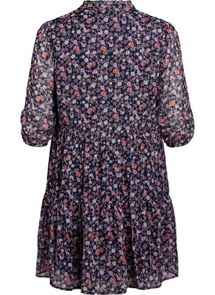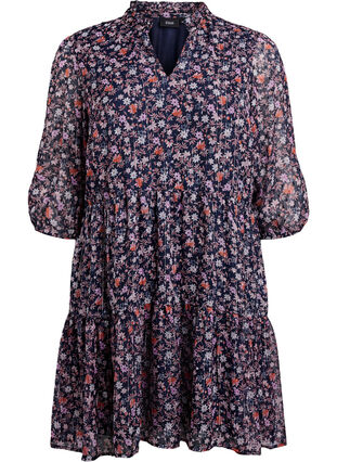 Tunika aus leichtem Stoff mit einem femininen geblümten Print und dezenten Glitzerfäden. Die Tunika hat einen Rundhalsausschnitt mit Rüschenkragen und V-Schlitz, sowie ein Futter für optimalen Tragekomfort. Sie hat leicht transparente 3/4-Ärmel mit elastischen Bündchen und eine A-Linien-Silhouette mit Nähten, die für einen weichen Fall und einen femininen Look sorgen.